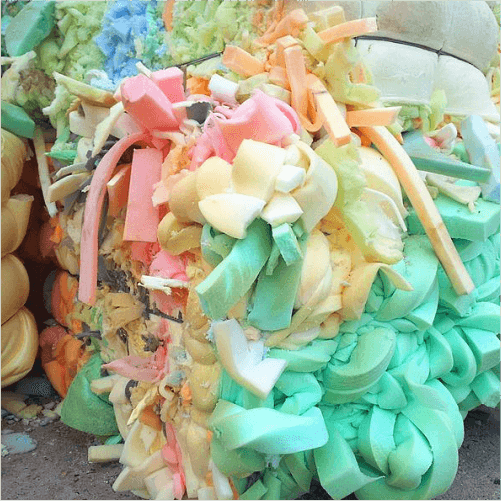 Clean, sorted polyurethane foam sourced from furniture, bedding, automotive, and packaging industries, used for recycling and reprocessing.