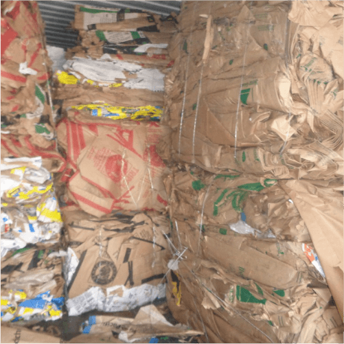 Heavy-duty multi-layered kraft paper bags sourced from cement, agricultural, and industrial packaging, used for recycling and fiber recovery.